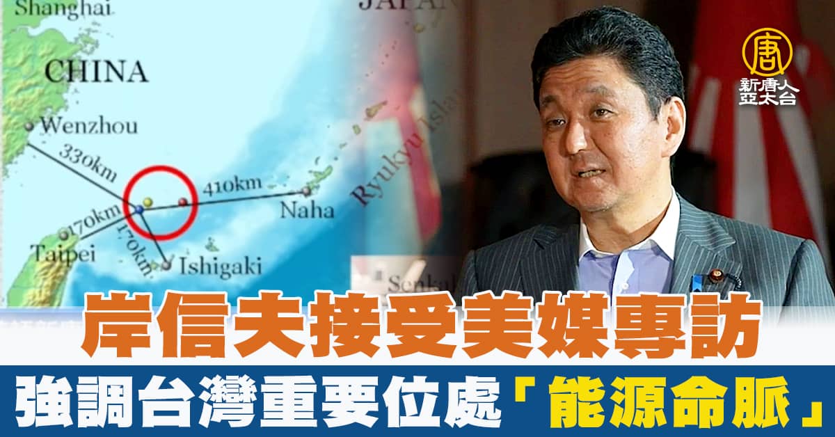 岸信夫在專訪中表示,台灣不僅位於東海和南海的交匯處,是地緣政治和戰略上非常重要的位置;台灣也位於日本的「能源命脈」上,「日本使用的能源,有90%是從台灣周圍地區進口」,因此維護印度太平洋保持自由開放,與台灣的和平穩定,對整個國際社會來說,都是非常重要的。英語新唐人新聞節目主持人 Tiffany Meier(2021.9.15):「中共和日本的巡邏船隻,最近在有爭議的領土上發生了衝突,最後中共海警船撞上了日本船隻。這次衝突是由於一群日本漁船航向尖閣諸島,中共聲稱這些島嶼是它們的,並派(海警)船攔截這些(日本)漁船。」
