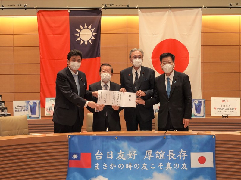駐日代表謝長廷代表政府捐贈1萬台血氧儀及1008台製氧機,由「日華懇」會長古屋圭司(右2)、幹事長岸信夫(左1)及副會長衛藤晟一代表接受。(圖/中央社)