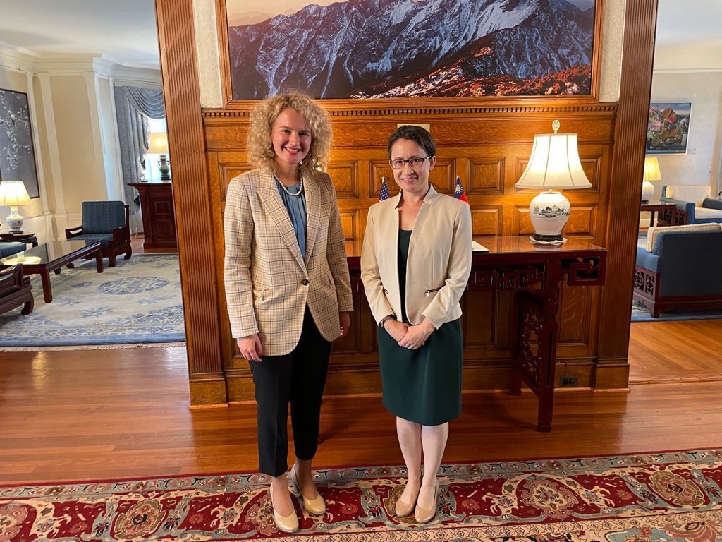 立陶宛經濟部長阿爾莫奈特(Aušrinė Armonaitė)(左)14日與駐美代表蕭美琴(右)在雙橡園會晤。(圖/翻攝自推特@ArmonaiteA)