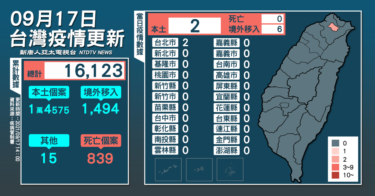 【新唐人亞太台 2021 年 09 月 17 日訊】今(17)日中央流行疫情指揮中心公布,國內新增2例本土及6例境外移入;另確診個案中無新增死亡。