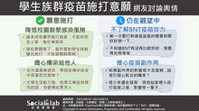 觀察「學生族群施打疫苗意願」的網路輿情,發現「願意施打」的網友表示,若學生先打疫苗,將有機會「降低校園群聚感染」,並認為近期開學,學生的移動性高,在人來人往的校園中,若不慎成為無感染症狀的感染者,不僅可能感染給同學、師長,造成病毒傳播的擴散,更可能傳染給家中長輩等具高風險族群,因此表達了願意施打BNT疫苗的想法。