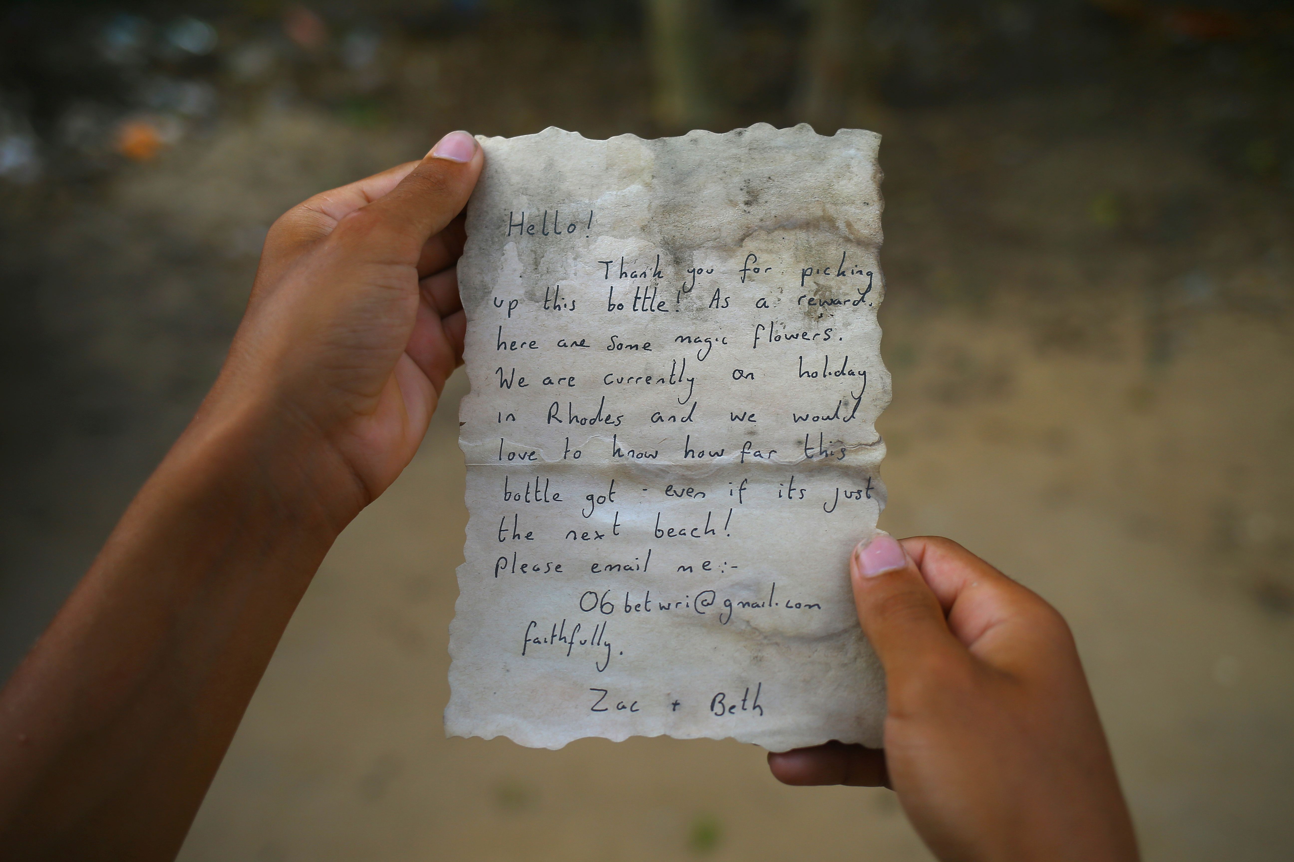 9歲女孩葛蘭姆(Abbie Graham)今年6月在夏威夷一處海灘,發現了這批瓶中信的第51瓶,其中明信片大小紙張上的字大多仍可辨識。