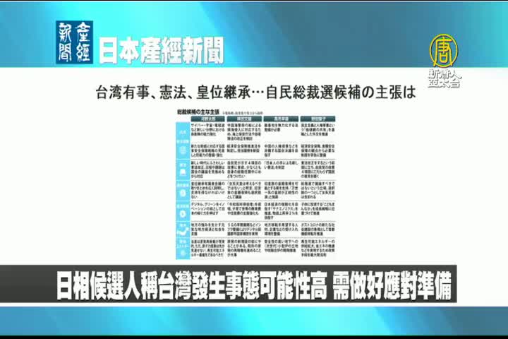 【新唐人亞太台 2021 年 09 月 20 日訊】來看到日本產經新聞報導:日本首相候選人高市早苗表示,台灣發生事態可能性高,需做好應對準備。