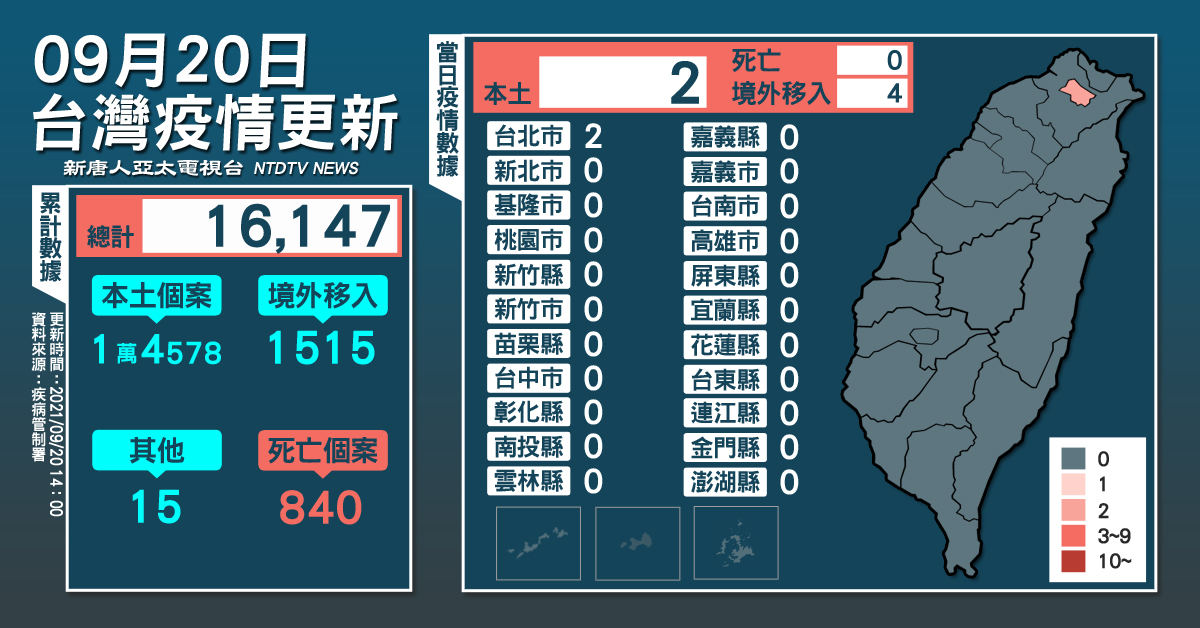 【新唐人亞太台 2021 年 09 月 20 日訊】央流行疫情指揮中心今(20)日公布國內新增6例COVID-19確定病例,分別為2例本土及4例境外移入;另,確診個案中無新增死亡。