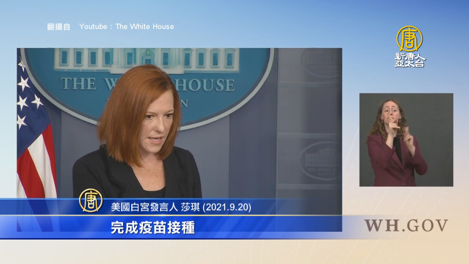 美國白宮發言人 莎琪(2021.9.20):「11月初,我們將實施嚴格的規定,避免COVID-19藉由國際航班旅客進入美國傳播,將要求來到美國的成年外國公民完成疫苗接種。」