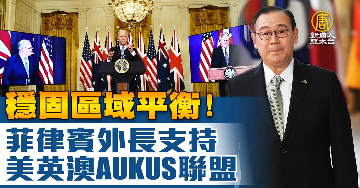 【新唐人亞太台 2021 年 09 月 21 日訊】接著來看到,菲律賓外交部長陸辛今天(21日)發布聲明,支持美國、英國和澳洲成立AUKUS防衛聯盟。他表示,東協成員國無論是單獨還是集體,都不具備足以維護東南亞和平與安全的軍事力量,阻止這個區域突然爆發的危機。美英澳成立AUKUS防衛聯盟,「能增強附近盟友(軍事)力量投射的能力,應該能恢復並穩固區域平衡,而非摧毀平衡。」陸辛指出,增強鄰近友邦和盟友的軍事力量,就能夠及時且相應定對這個區域的威脅和挑戰。陸辛表示,澳洲的行動也反映了澳洲對印太地區地理失衡的擔憂,只要實際上沒有裝配核子武器,AUKUS聯盟的動作就沒有違反1995年簽訂的「東南亞無核武器區條約」。