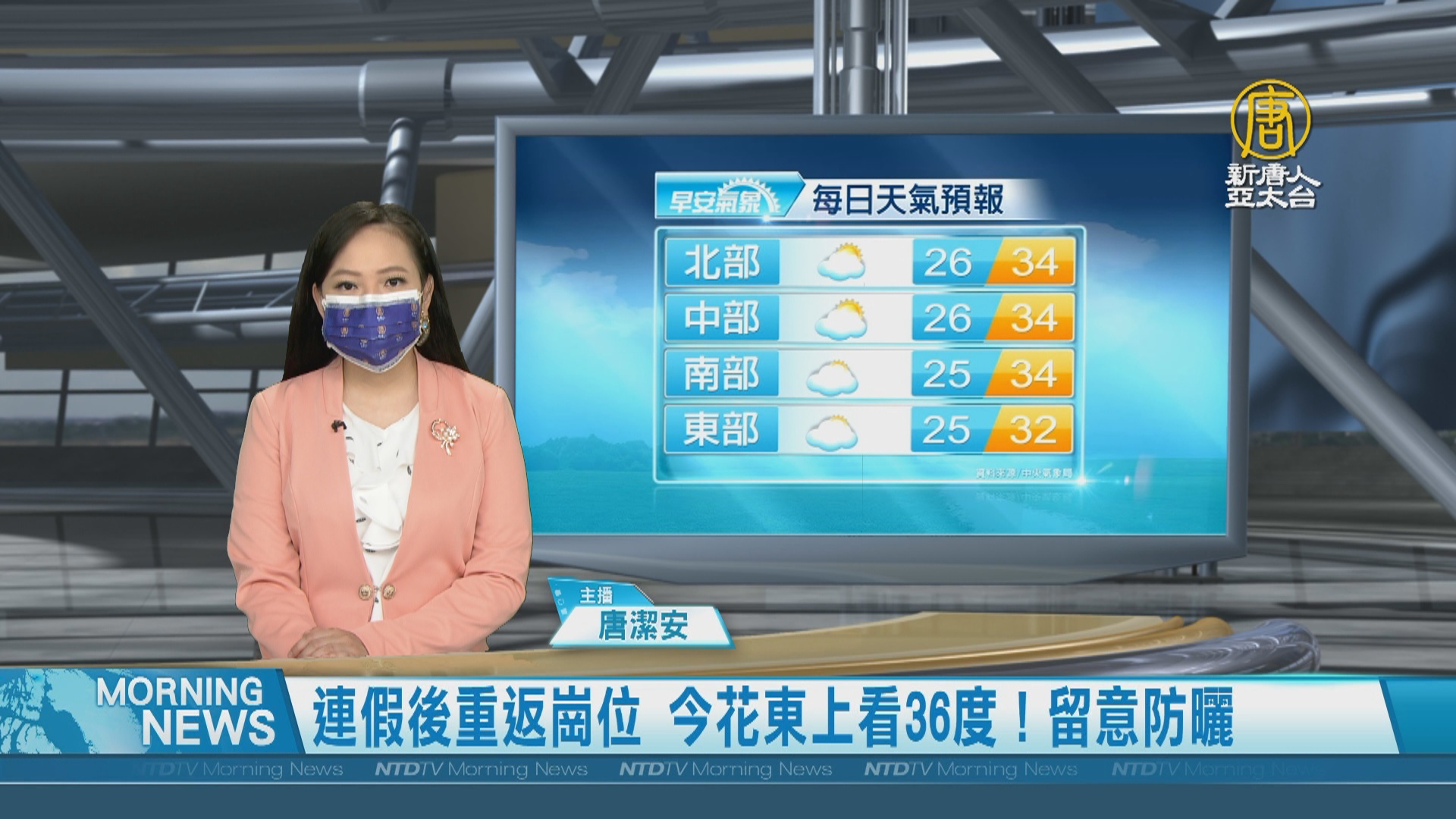 【新唐人亞太台 2021 年 09 月 22 日訊】歡迎您收看9月22日的早安新唐人,我是唐潔安,先來帶您關心天氣。結束中秋連續假期,觀眾朋友今天重返工作崗位,各地天氣大多是多雲到晴,花蓮縣被列為高溫橙色燈號,台東縣為黃色燈號,提醒您注意防曬,避免熱傷害。帶您一起來看到,國際媒體重要訊息。