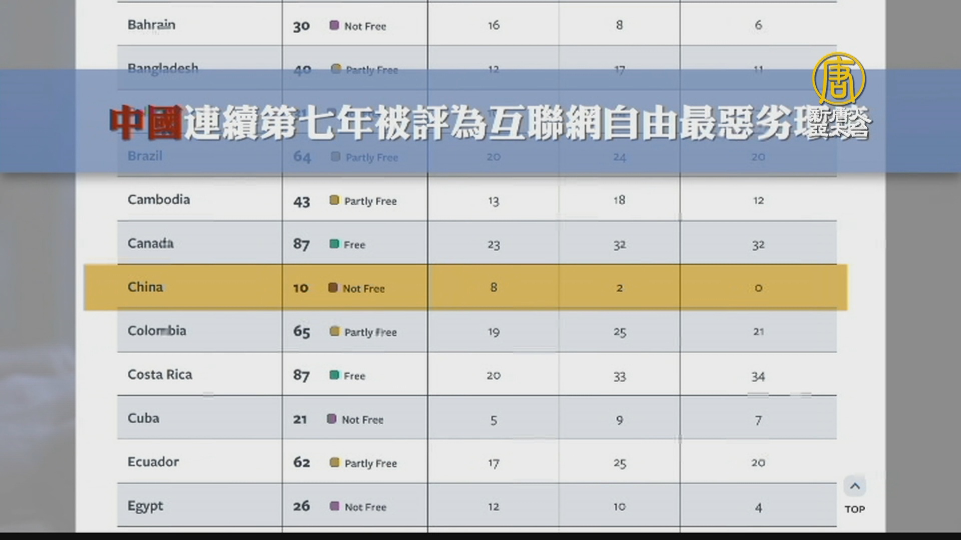 中國連續第七年被評為網際網路自由最惡劣環境。報告指出,中共當局對網路異議、獨立報導、甚至日常通訊都施以嚴厲的監禁懲罰,其中,中共病毒疫情仍是受審查最嚴厲的內容之一。普通用戶分享新聞、談論宗教或與海外親友正常的通訊交流,都會面臨法律後果。