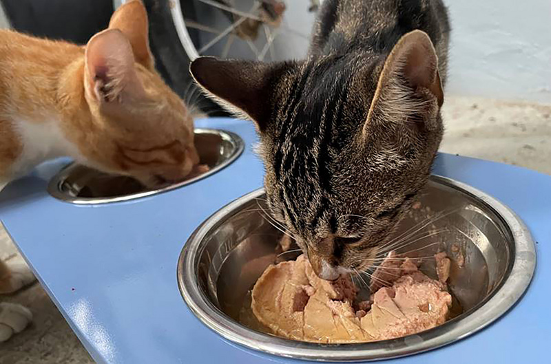 農委會苗栗農改場22日宣布國內首度成功研發蠶蛹貓罐頭,讓貓奴餵食貓咪時有更多選擇。苗改場指出,經養貓飼主自願受試調查,有超過70%貓咪可接受添加蠶蛹的罐頭。(圖/農委會提供)