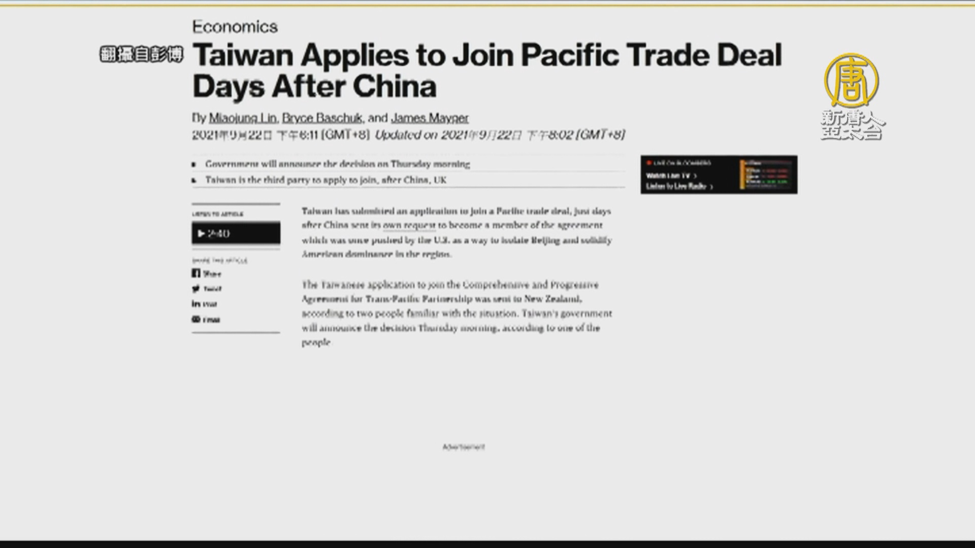 【新唐人亞太台 2021 年 09 月 22 日訊】歡迎回來,中共上週四宣布,申請加入《跨太平洋夥伴全面進步協定》(CPTPP) 。外媒彭博週三 (22 日) 報導,台灣已將加入 CPTPP 的申請文件寄送至紐西蘭,最快週四 (23 日) 發布公開聲明。經濟部次長陳正祺證實,台灣已正式遞出加入跨太平洋夥伴全面進步協定(CPTPP)申請,經濟部長王美花明天(23日)早上會對外說明。