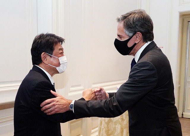 日媒報導,有關台灣正式申請加入CPTPP一事,正在紐約訪問的日本外務大臣茂木敏充表示歡迎。圖為茂木敏充與美國國務卿布林肯(Antony Blinken)在紐約會面。(圖/翻攝自推特@moteging)