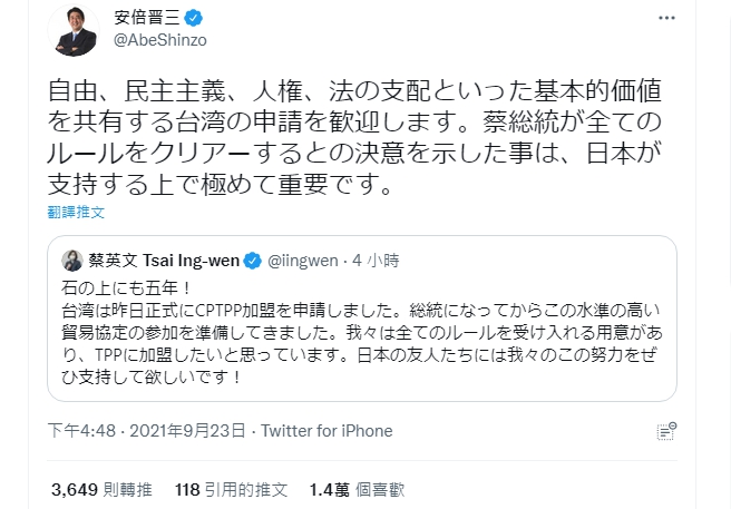 安倍晉三今天傍晚在推特發文回應寫道:「對於與日本共享自由、民主、人權、法治基本價值的台灣正式提出申請加入CPTPP一事表示歡迎。蔡總統展現台灣已準備好接受所有規則的決心,這是日本在支持台灣加入CPTPP時極為重要的。」