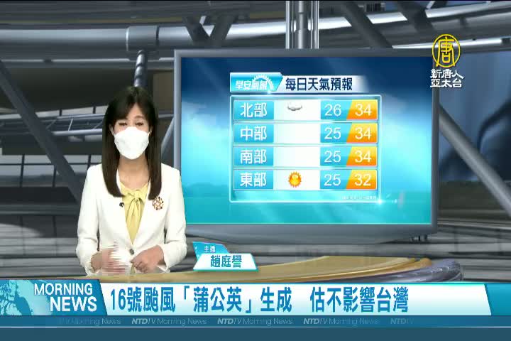 【新唐人亞太台 2021 年 09 月 24 日訊】歡迎您收看9月24日的早安新唐人,我是趙庭譽,先來帶您關心天氣。東北風接近,今天一直到星期天,迎風面基隆北海岸、大台北地區,降雨機會提高,氣溫略降。另外,昨天,今年第15號颱風「電母」,和第16號颱風「蒲公英」相繼生成,不過氣象局表示,即使雙颱共存,都不會對台灣有直接影響。帶您一起來看到國際媒體重要訊息。