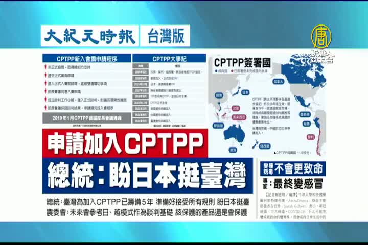 【新唐人亞太台 2021 年 09 月 24 日訊】接著看到大紀元時報台灣版報導:申請加入CPTPP,總統表示,盼日本挺台灣。