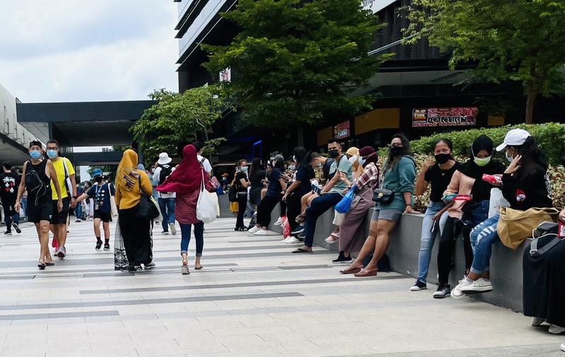 新加坡23日新增1504人確診,再度刷新星國單日確診人數的最高紀錄,圖為巴耶利峇地鐵站附近廣場的人群。攝於19日。(圖/中央社)