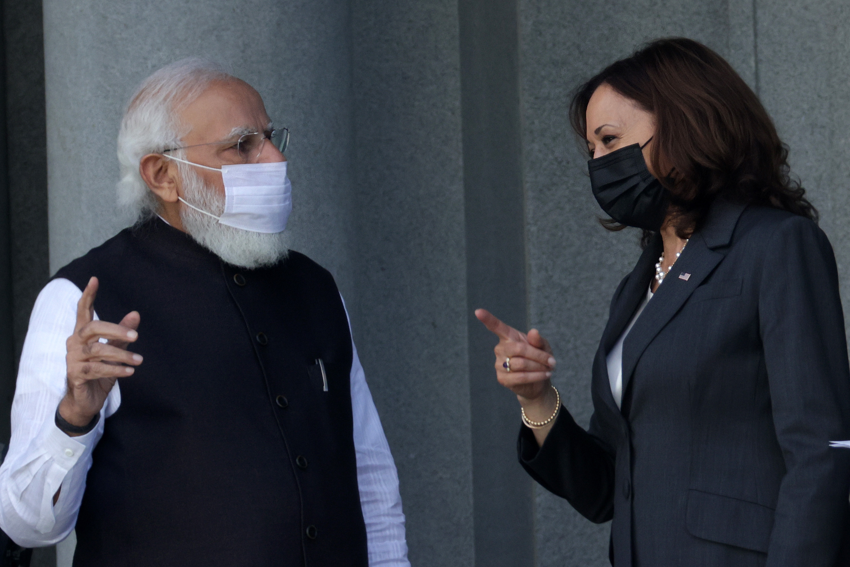 美國、澳洲、日本和印度組成的四方安全對話,24日在華府首次召開面對面領袖峰會,美國副總統賀錦麗在會前接待印度總理莫迪。(圖/GettyImages)