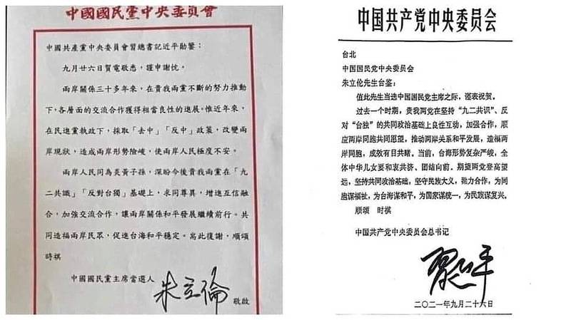 習近平發賀電(圖右)恭喜朱立倫當選國民黨主席,朱立倫在覆電(圖左)表示,希望今後兩黨在「九二共識」、「反對台獨」基礎上,求同尊異,增進互信融合,加強交流合作。(圖/中國國民黨提供)