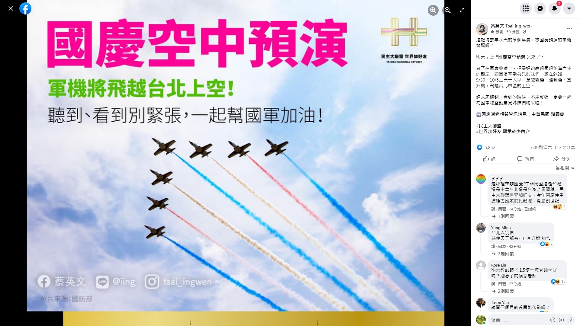 「還記得去年秋天的某個早晨,被國慶預演的軍機驚醒嗎?」蔡總統晚間透過臉書發文指出,「明天早上國慶空中預演又來了」。