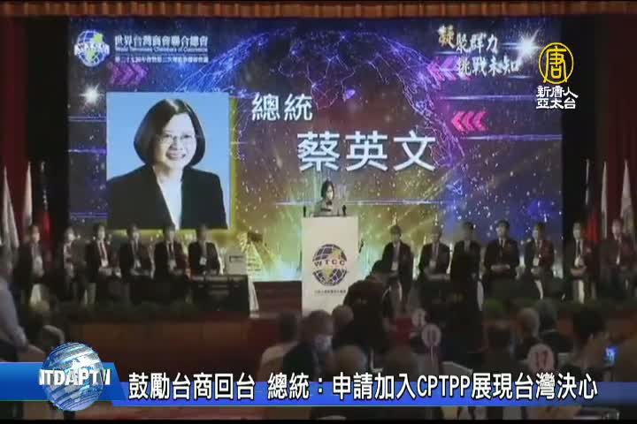 【新唐人亞太台 2021 年 09 月 28 日訊】歡迎回來,總統蔡英文今天出席世界台灣商會聯合總會活動,總統致詞時表示,為了讓台灣走向世界,政府上周已經申請加入CPTPP,她說「這展現出台灣的決心,我們也做好了準備,希望所有台商朋友可以一起幫忙,為台灣在世界各國打開更多的商機。」