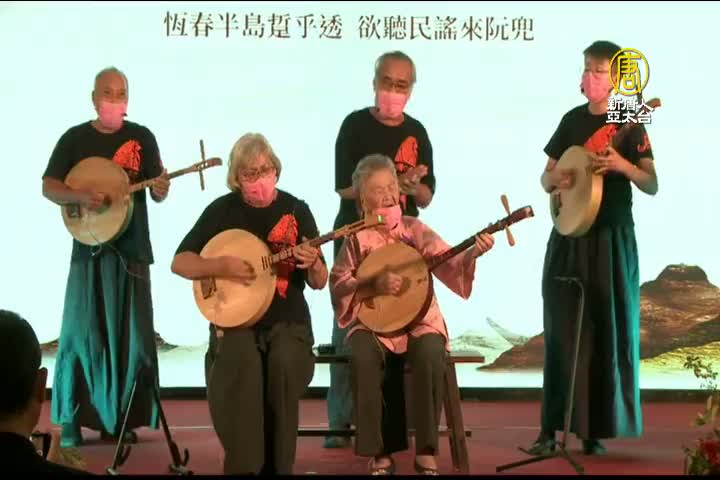 恆春民謠保存者陳英和恆春民謠促進會會員們,現場自彈自唱將得獎的感言編寫成歌謠唱出來。