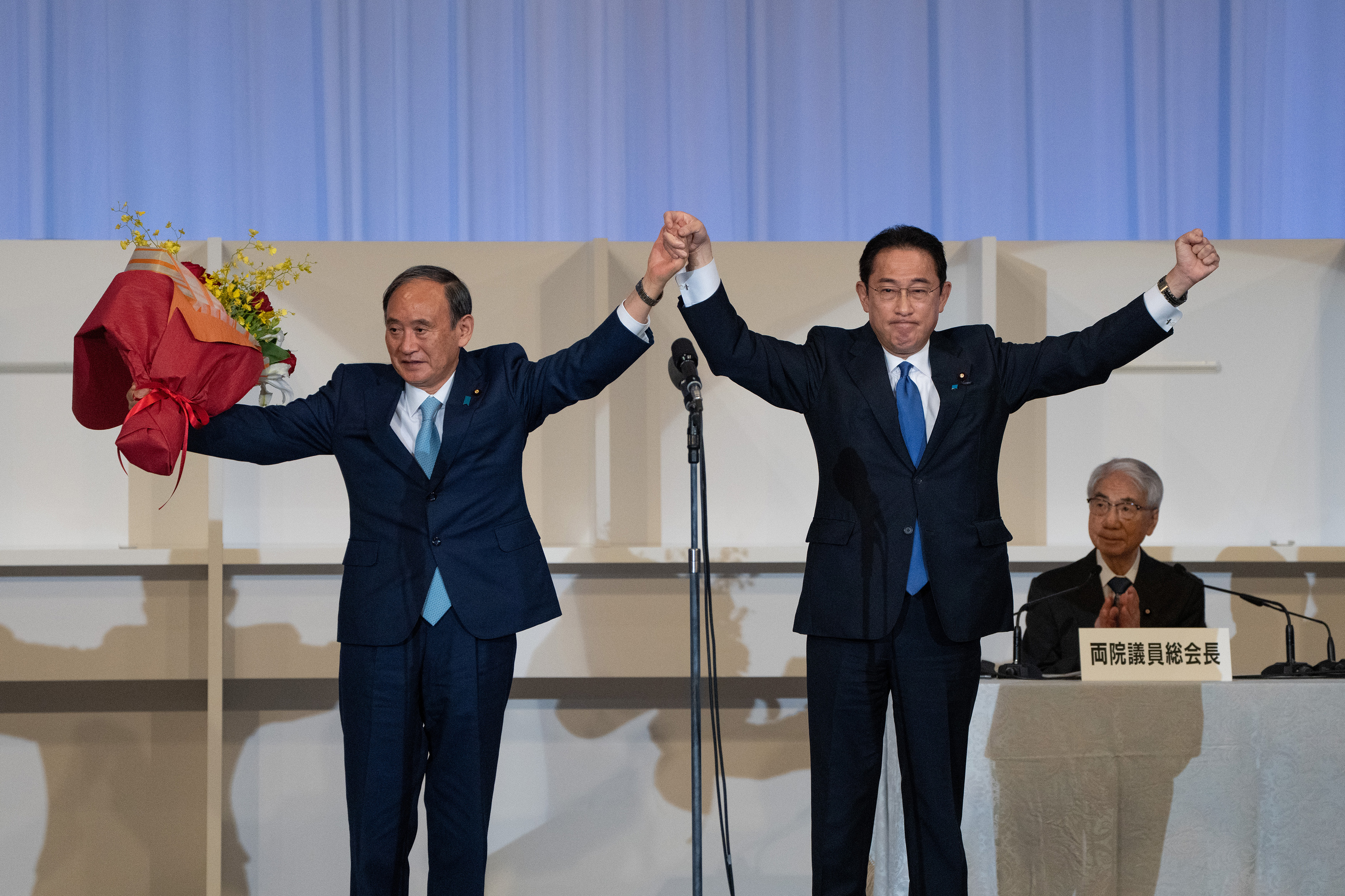 選舉結果出爐後,原本是自民黨總裁、現任首相菅義偉在自民黨眾、參議員大會上致詞恭賀岸田當選總裁。岸田隨後發表當選感言說:「我們一定要讓人民看到『脫胎換骨的自民黨』,總裁選舉已結束,大家要團結迎接眾議院選舉、參議院選舉。」