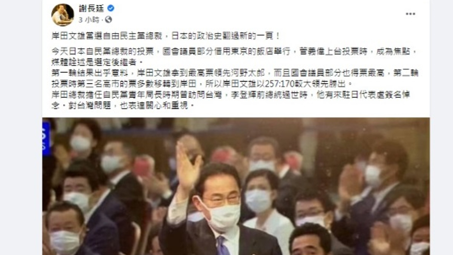 謝長廷在臉書上寫道:「岸田文雄當選自由民主黨總裁,日本的政治史翻過新的一頁!」