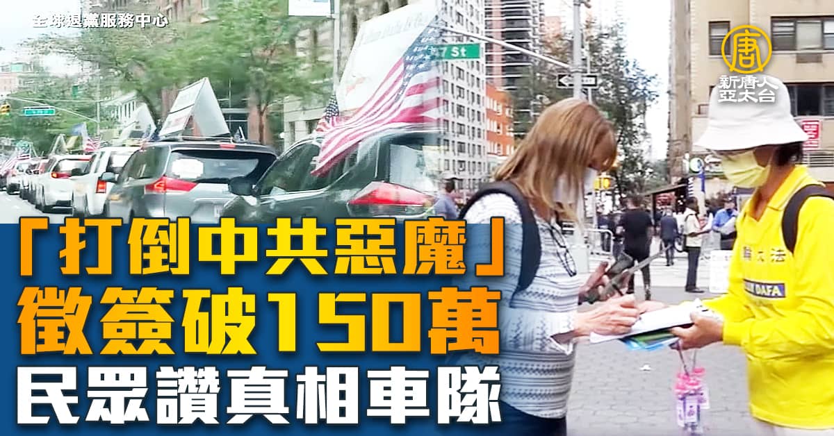 【新唐人亞太台 2021 年 09 月 29 日訊】在聯合國大會期間,全球退黨服務中心的真相車隊,也在附近遊行,贏得民眾讚賞,而「打倒中共惡魔」的徵簽在週三,獲得超過150萬民眾響應。