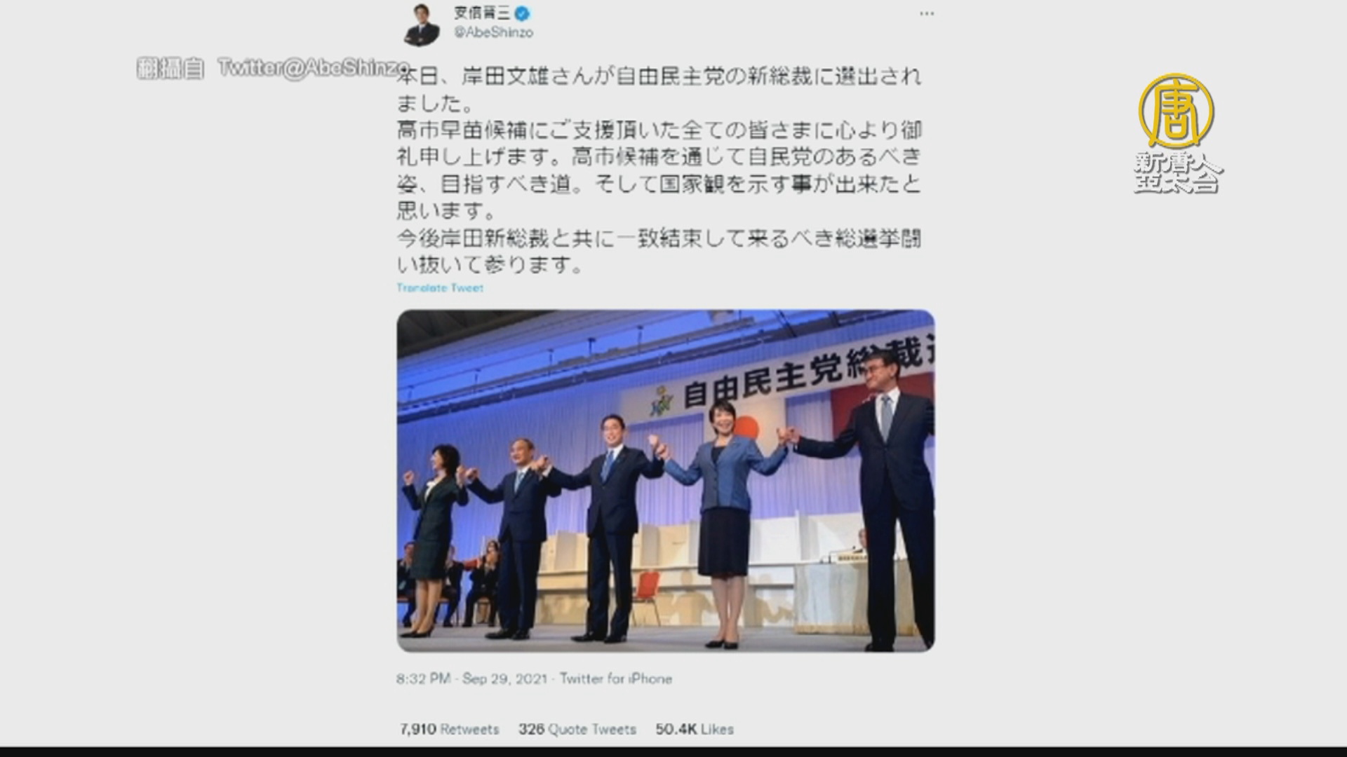 【新唐人亞太台 2021 年 09 月 30 日訊】前日本首相安倍晉三在推特發文,祝賀岸田文雄當選,他寫道,今後將與岸田一起團結,為即將到來的大選奮鬥。而親台立場鮮明的高市早苗也發文寫道,雖然結果不如人意,但在國會投票中獲得第二名令人鼓舞。她說「我會進一步完善我的政策,盡我所能。」