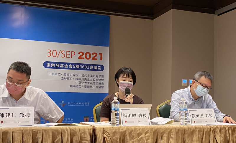 國策研究院及當代日本研究學會30日合辦「日本自民黨總裁選舉與台海安全情勢」座談會,日本學者福田圓(中)等學者出席。(圖/中央社)
