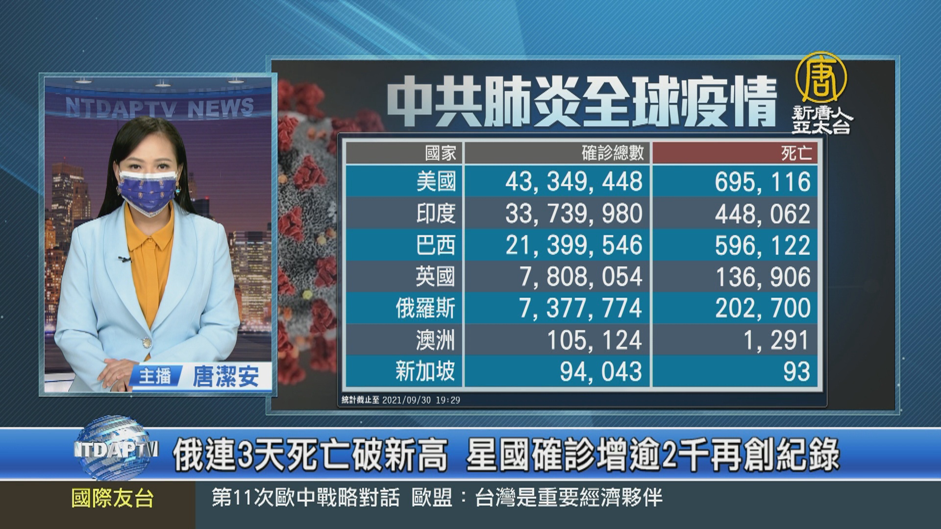 【新唐人亞太台 2021 年 09 月 30 日訊】來關心中共肺炎疫情最新情況,全球確診超過2億3千328萬例,死亡4百77萬4千多人。但中共、伊朗等國家,被認為嚴重低報數據。亞洲方面,俄羅斯新增確診2萬3千多例、死亡867例,單日死亡新增數連續第3天破新高。新加坡確診新增2千2百多例,連續2天創下自爆發疫情以來的單日新高紀錄,也是新加坡連續第9天單日新增超過1千例。澳洲第二大城墨爾本所在的維多利亞省,新增1千4百多例確診,不僅創下單日新高紀錄,也是該省首度單日病例破千。