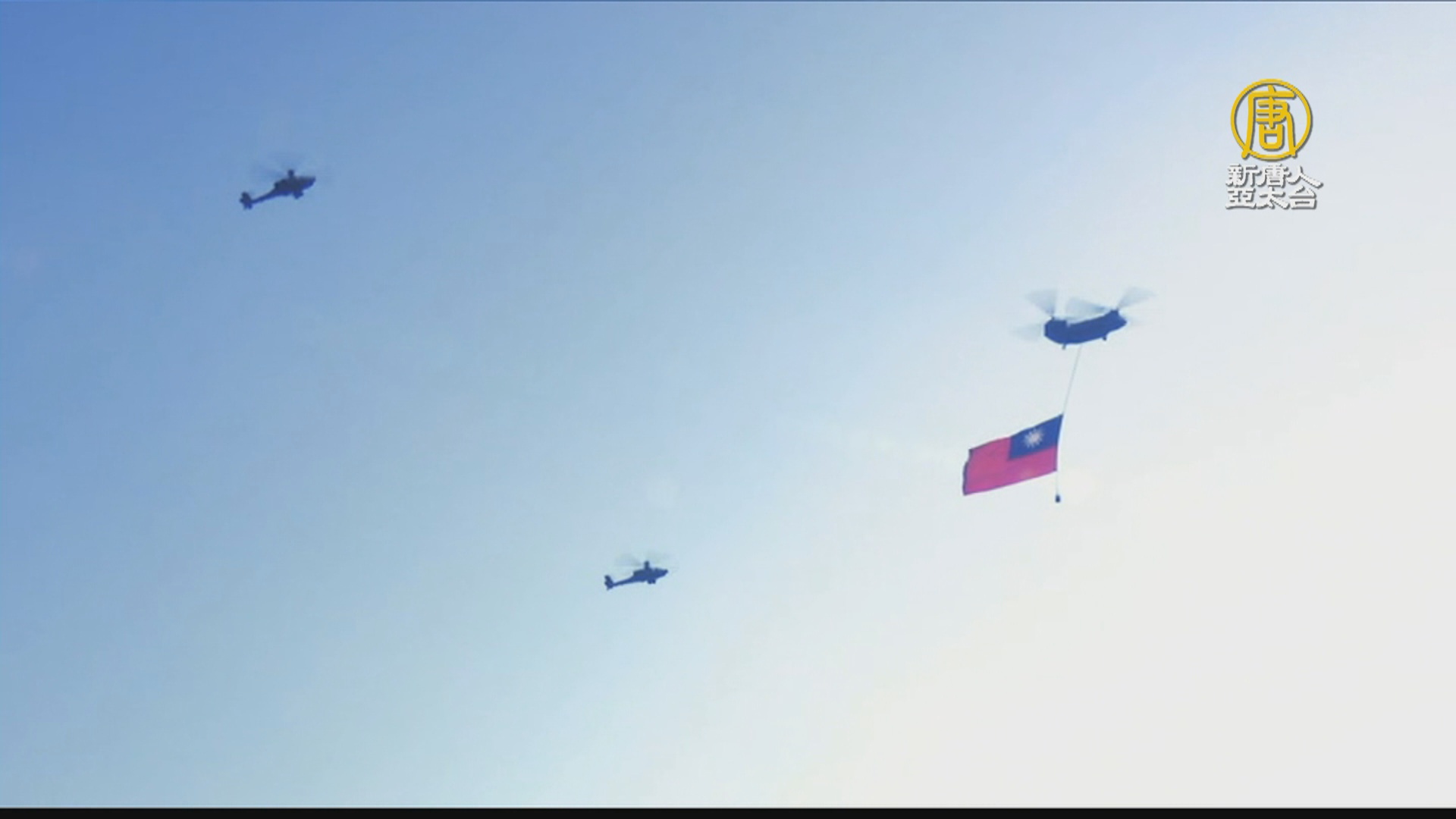 【新唐人亞太台 2021 年 09 月 30 日訊】隨著雙十國慶即將到來,今(30日)天一早,國軍及空勤總隊在總統府前進行第一次空中全兵力預演,有47架次、12型機飛越總統府前廣場上空。最吸睛的就是2架CH-47直升機吊掛著史上最大的巨型國旗通過。雷虎小組也在空中施放紅白藍彩煙,場面壯觀。