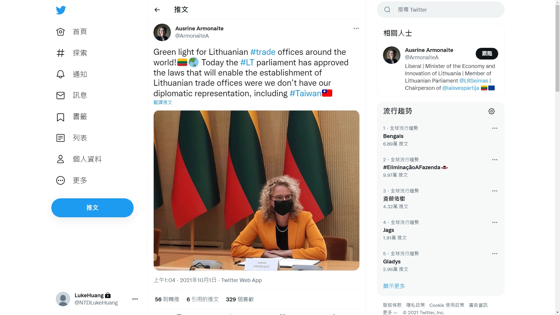 立陶宛經濟暨創新部長阿爾莫奈特在推特發文表示,立陶宛國會通過修法,為設駐台經貿代表處開綠燈。(圖/翻攝自推特@ArmonaiteA)