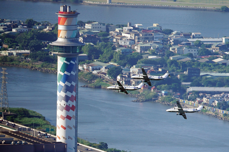 雙十國慶空中全兵力預演5日早晨在台北市上空展 開,B-1900C行政專機編隊飛行從淡水河口進入台北 市,經過北投焚化爐往總統府方向前進。(圖/中央社)