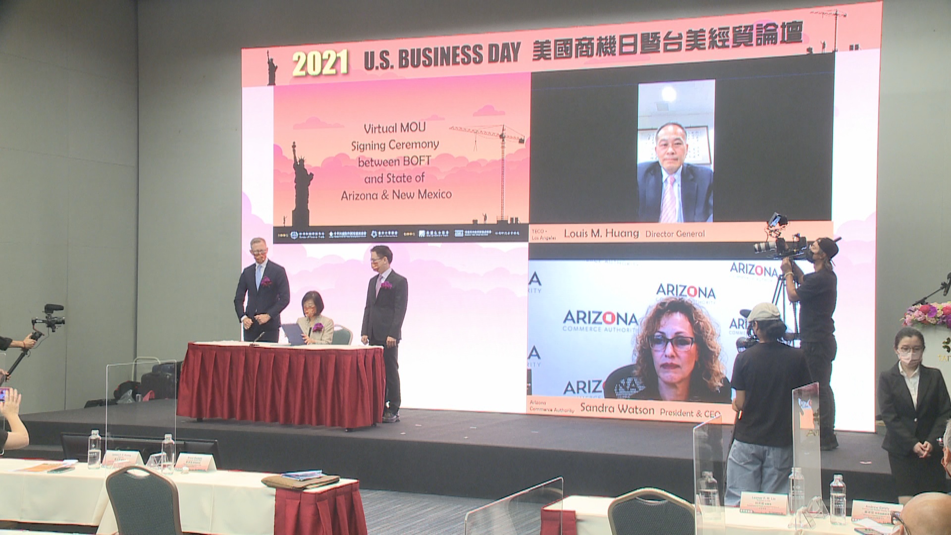 貿協董事長黃志芳、美國AIT官員見證下,經濟部貿易局與美國亞利桑那州、新墨西哥州,共同簽署合作備忘錄(MOU),向台灣業者招手「東進美國」投資,尤其美國製造在地比重,未來要超過60%。
