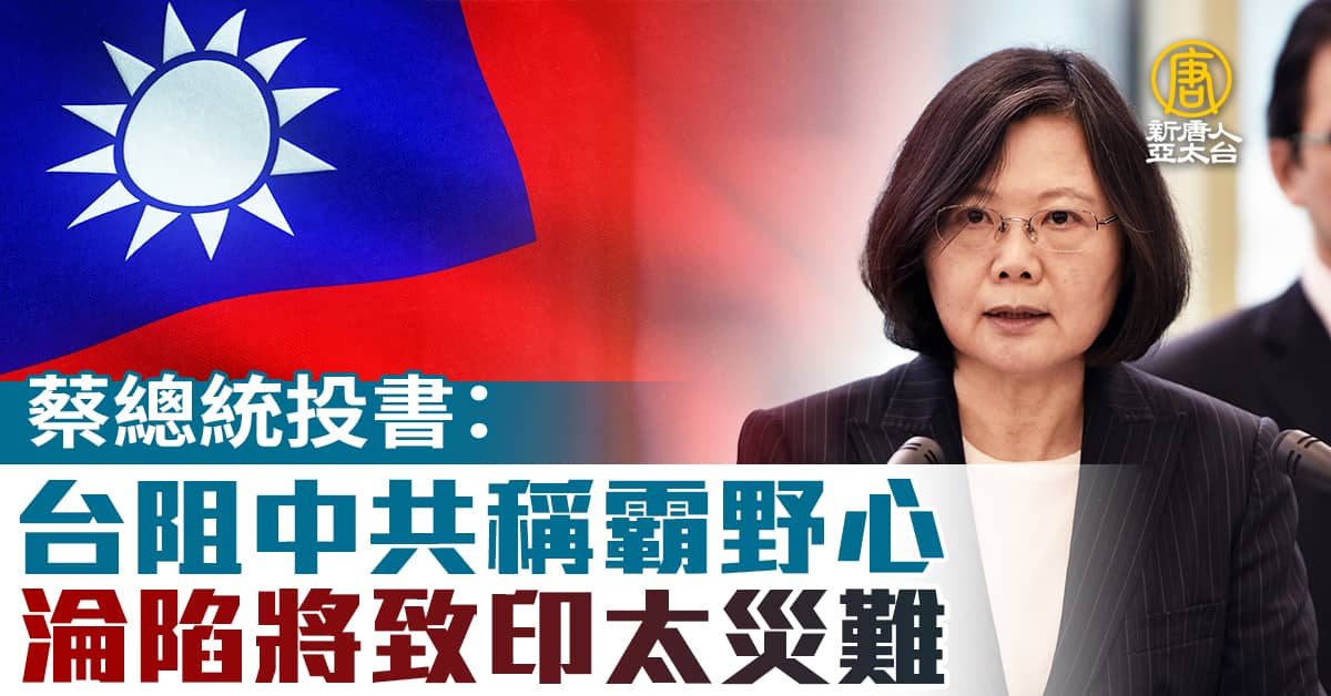 蔡總統投書:台阻中共稱霸野心 淪陷將致印太災難