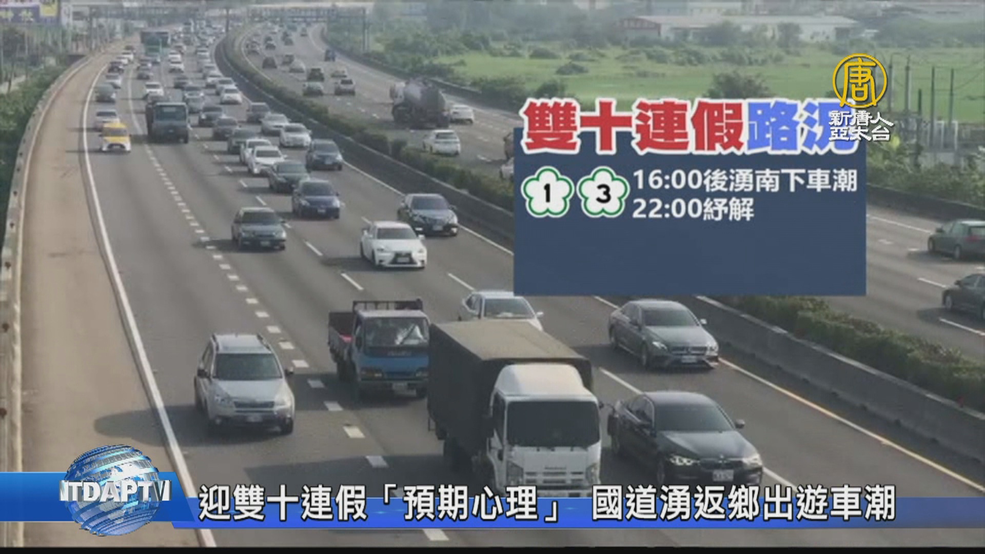 【新唐人亞太台 2021 年 10 月 08 日訊】雙十連假今天(10月8日)下班後正式展開,不少民眾為了避開雙十連假塞車潮,一早就提前南下返鄉,特別國五早上10點就出現車多壅塞,時速一度只剩下24公里,到了下午通過雪隧至少要花上半小時,高公局預估恐怕一路塞到午夜,另外原本在菲律賓東方海面上的熱帶性低氣壓,下午兩點正式形成「圓規颱風」,國慶日當天下午,全台天氣將受到影響。