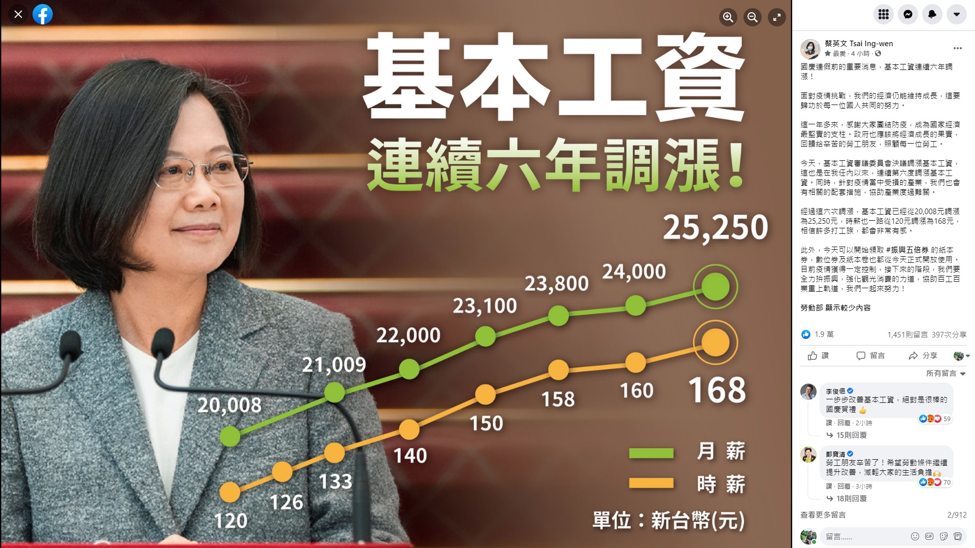 總統說,經過這6次調漲,基本工資已經從2萬8元調漲為2萬5250元,時薪也一路從120元調漲為168元,相信許多打工族,都會非常有感。