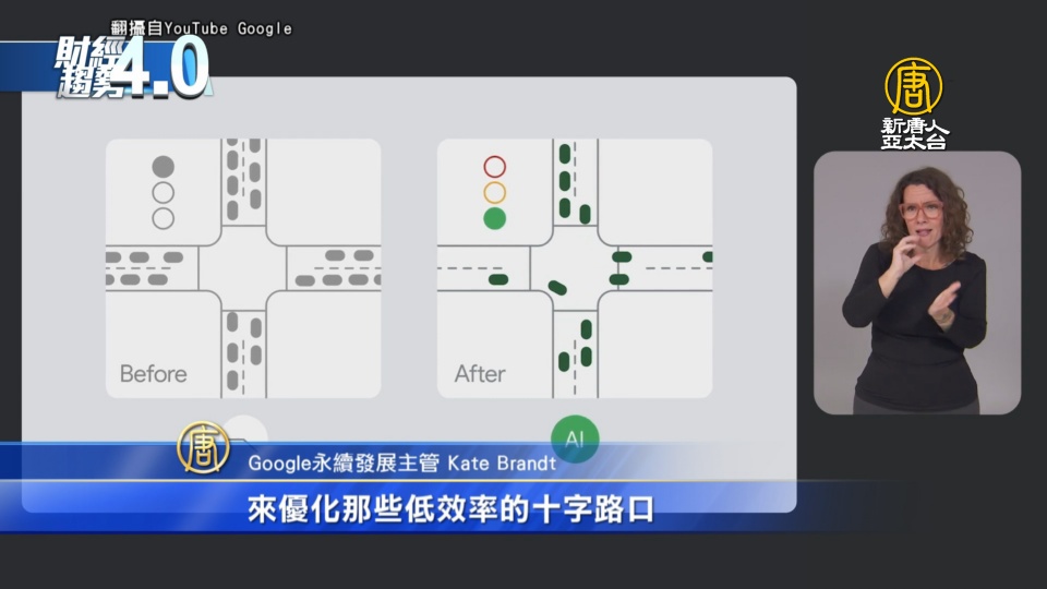 Google永續發展主管 Kate Brandt:「我們的人工智慧研究小組找到了一種方法,來準確計算世界各地城市中大多數十字路口的交通狀況和時間,然後他們正根據這些數據訓練一個模型,來優化那些低效率的十字路口。」