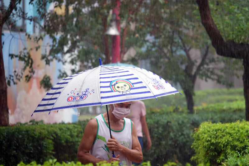 中央氣象局11日發布豪雨特報,受颱風圓規外圍環流影響,易有短延時強降雨,在短時間內降雨猛烈。宜蘭縣及花蓮縣有局部大雨或豪雨發生,基隆北海岸、大台北、桃園地區及新竹、台中山區有局部大雨發生。圖為桃園地區民眾上午撐傘健行、運動。(圖/中央社)