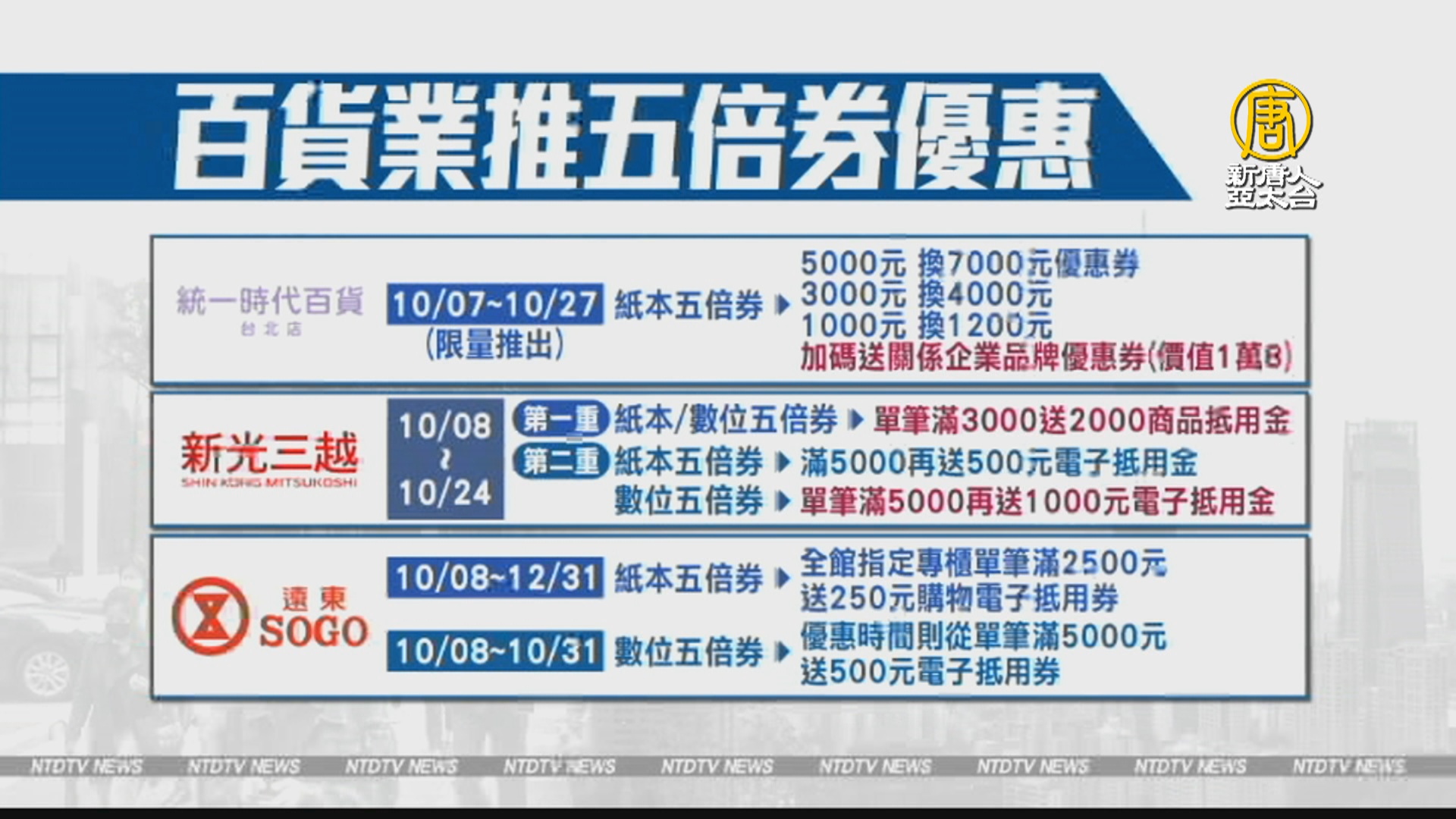 【新唐人亞太台 2021 年 10 月 11 日訊】來看到,五倍券上路第四天,適逢國慶連假,不少民眾前往百貨公司消費,就是看準各大百貨業者祭出的加碼優惠,有業者祭出拿5000元紙本券,就能兌換7000元優惠券,也讓百貨公司的業績,相比去年三倍券同期,成長了五倍。
