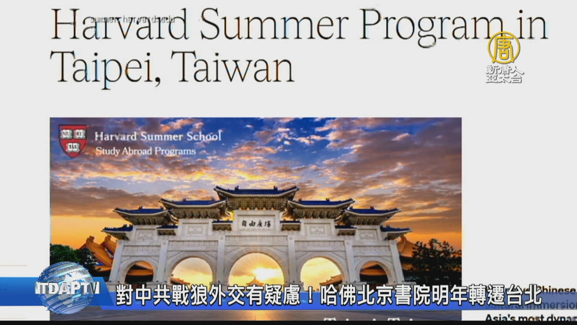 【新唐人亞太台 2021 年 10 月 12 日訊】美國哈佛大學刊物「哈佛紅報」報導學校知名的暑期中文進修計劃「哈佛北京書院」,因為原合作方北京語言大學日益「不友善」,所以將從明年2022年開始,改與台灣大學合作,並更名為「哈佛台北書院」。