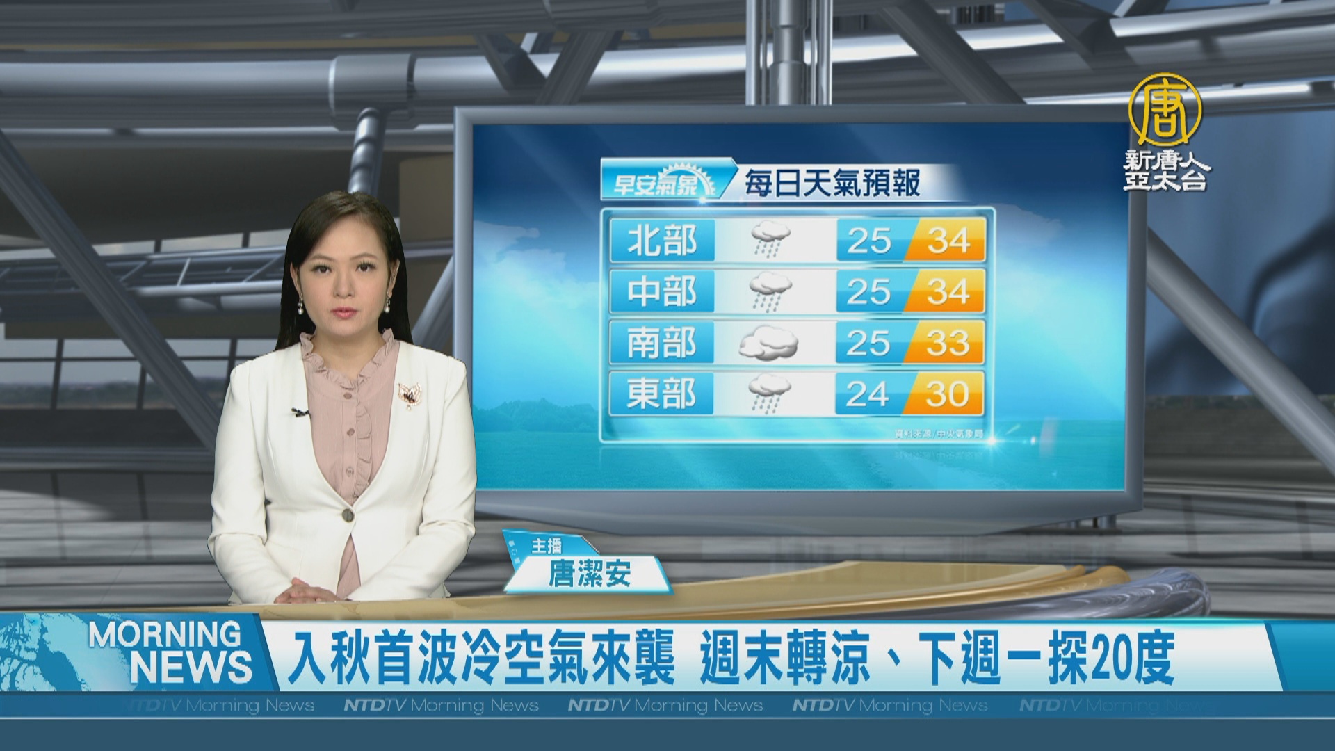 【新唐人亞太台 2021 年 10 月 13 日訊】歡迎您收看10月13日的早安新唐人,我是唐潔安,先來帶您關心天氣。氣象局預測週末將會有入秋首波冷空氣來襲!到時候北台灣天氣轉涼,北部、宜蘭、花蓮會有明顯降溫,而下周日、下周一,17日、18日,受東北風影響,高溫約24度至25度,低溫可能接近20度左右,提醒觀眾朋友留意天氣變化。帶您一起來看到國際媒體重要訊息。