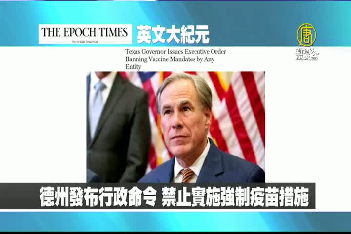 【新唐人亞太台 2021 年 10 月 13 日訊】首先來看到美國大紀元英文版報導:德州州長發布行政命令,禁止任何實體實施強制疫苗措施。