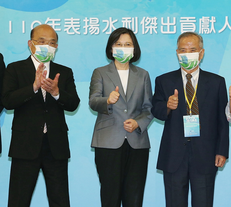 經濟部水利署13日舉辦「涓滴守護 韌性台灣」表揚水利傑出貢獻人員及團體典禮,總統蔡英文(中)、行 政院長蘇貞昌(左)頒發終身成就獎給經濟部水利署前副署長林火木(右)。(圖/中央社)