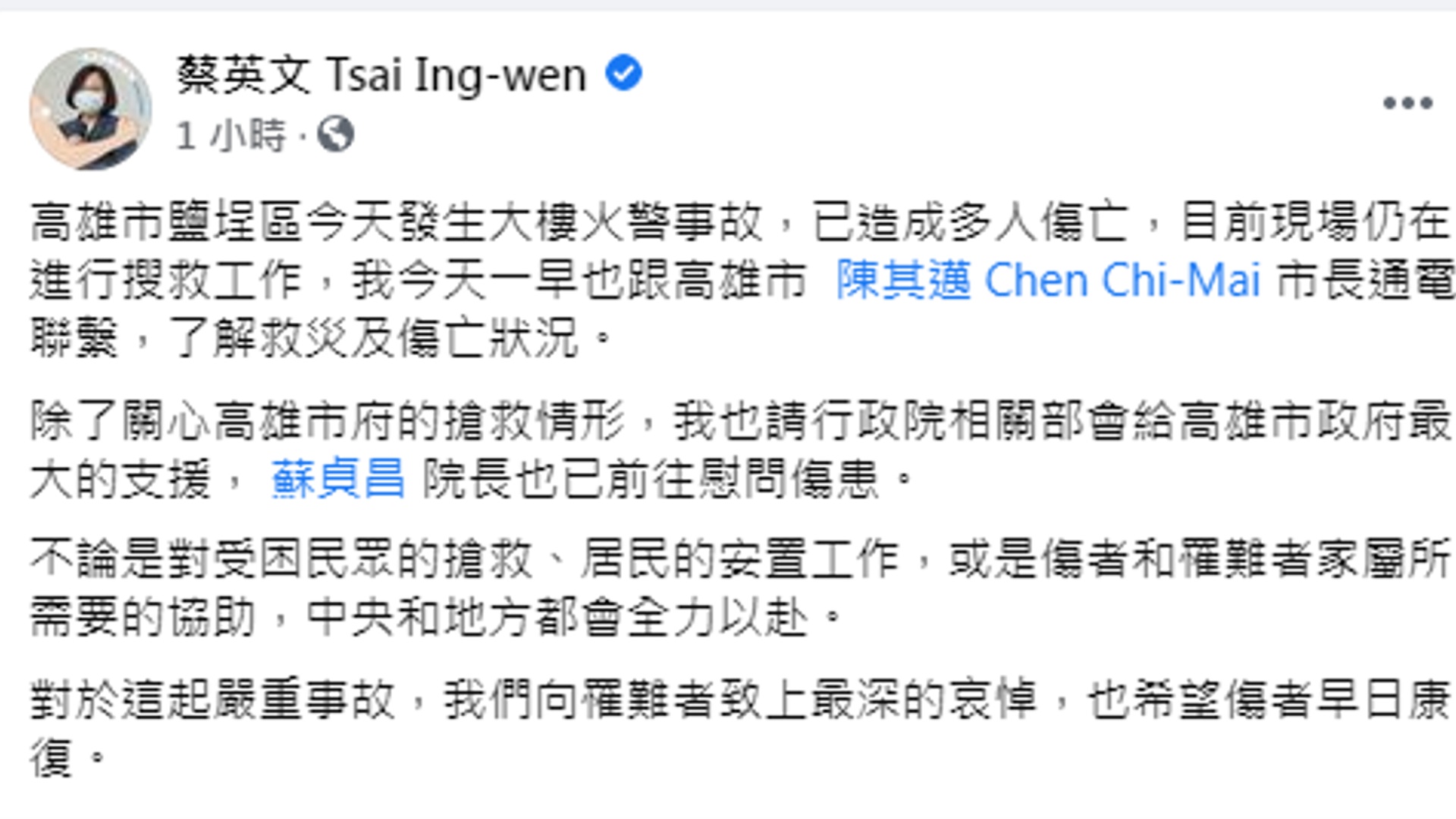 蔡總統下午(14日)透過臉書指出,高雄市鹽埕區今天發生大樓火警事故,已造成多人傷亡,目前現場仍在進行搜救工作,她今天一早也跟高雄市長陳其邁通電聯繫,了解救災及傷亡狀況。(圖/翻攝自總統蔡英文臉書)