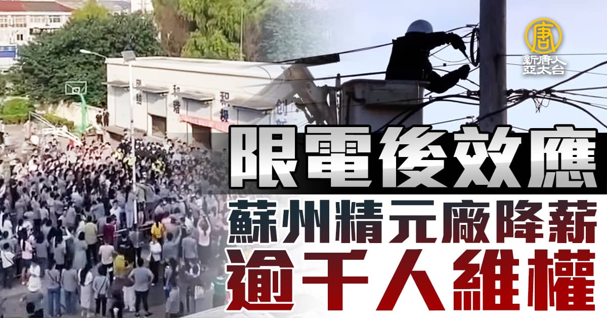 【新唐人亞太台 2021 年 10 月 14 日訊】中國多地限電不僅造成原物料飛漲、產業鏈大亂,在江蘇更引發大規模抗議潮。10月中旬,蘇州吳江精元電腦公司,因為限電放假時間增多,「小時工」被降薪及裁員,引來上千名員工連續多日上街維權,大批警察到場維穩。