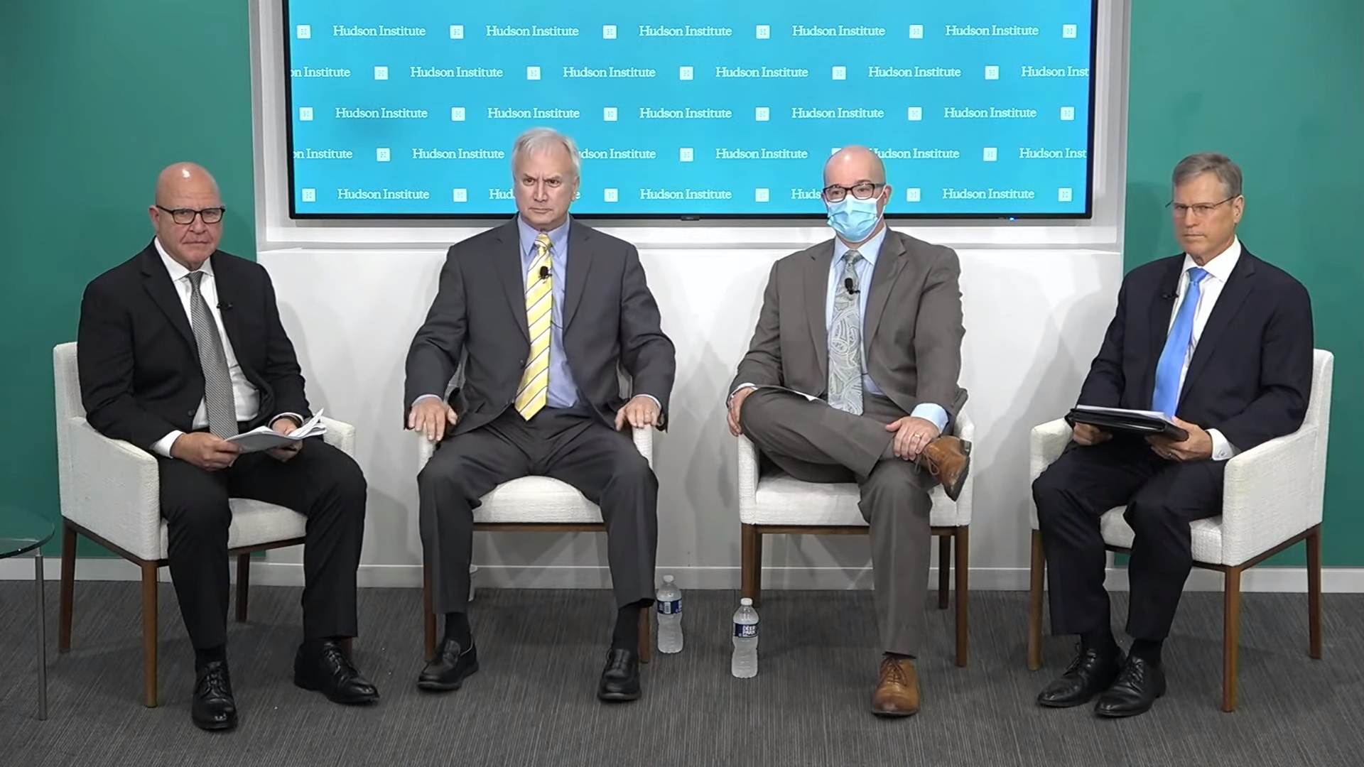 10月4日,「哈德遜研究所」(Hudson Institute)舉辦了一場論壇,探討維護台海和平。參與者從左至右依序為:麥馬斯特(H.R. McMaster)、斯托克斯(Mark Stokes)、哈羅德(Scott Harold)、克羅寧(Patrick Cronin)。(圖/翻攝自YT@Hudson Institute)