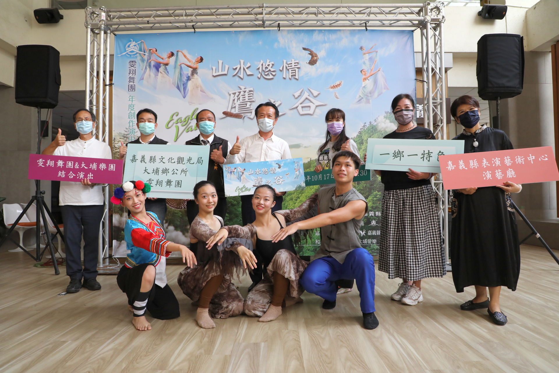 以大埔自然人文及傳說故事「紅花園」為題材,創作最新舞作《山水悠情、鷹之谷》,上午在縣府宣傳表演。(嘉義縣政府提供)