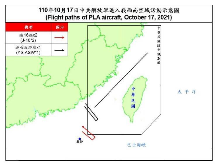 2021-10-18 09:05:58中共17日又派出3架共機闖入台灣西防空識別區,包括 2架殲-16,與1架運-8反潛機,空軍派遣空中巡邏兵力應對、並以廣播驅離、和啟動防空飛彈追監。其中殲-16飛行航線相較10月4號空警五百,是更為逼近台灣東沙島。