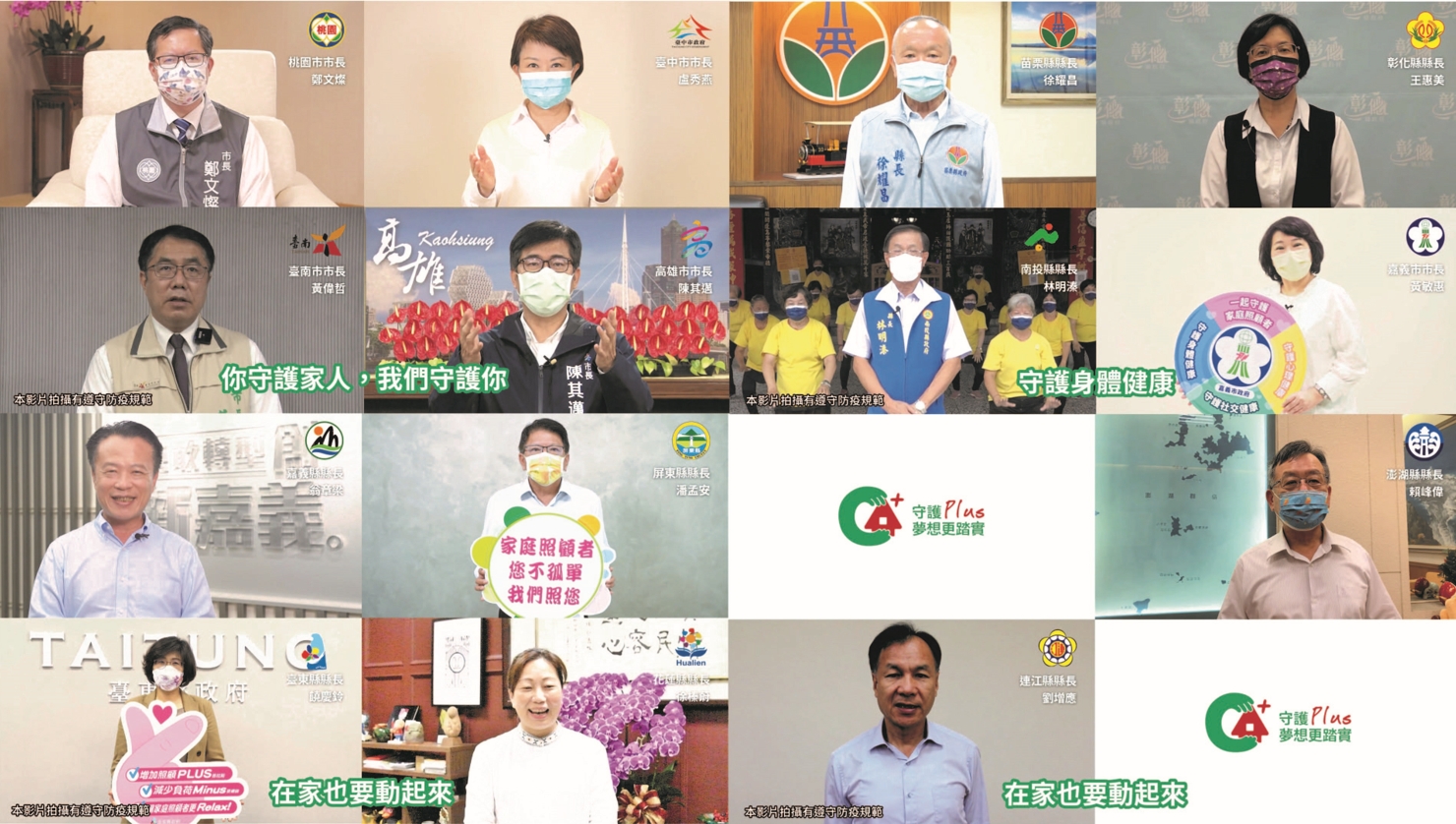 家總邀請桃園市長鄭文燦、臺中市長盧秀燕、臺南市長黃偉哲、高雄市長陳其邁、苗栗縣長徐耀昌 、彰化縣長王惠美、南投縣長林明溱、嘉義市長黃敏惠 、嘉義縣長翁章梁、屏東縣長潘孟安、臺東縣長饒慶鈴、花蓮縣長徐榛蔚、澎湖縣長賴峰偉、連江縣長劉增應等縣市長響應守護健康一起來串連影片,為照顧者打氣(合庫人壽 提供)